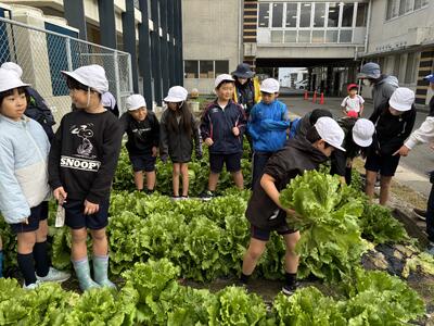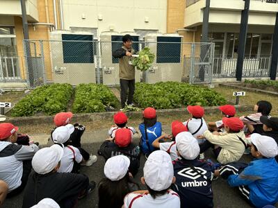 3年生が総合的な学習の時間に「レタス収穫体験」を行いました。開校時から毎年お世話になっている小田さんに今年度もご指導いただき、種まきから苗植え、水やり、草取り等のお世話を経て、立派なレタスを収穫することができました。小田さんありがとうございました。