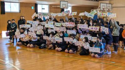 両校の児童、生徒、職員が五和中学校の体育館に集まって「小中対面式」を行いました。児童会生徒会から今年度の合同スローガン「みがくあいさつ、広がる笑顔」が発表され、そのあとは「じゃんけん大会」で交流しました。