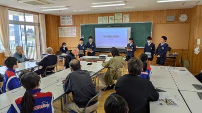 学校評価の結果をもとに、委員の皆様から今年度の学校運営に関するご意見等をいただきました。後半は、中学校生徒会と小学校児童会の代表が加わり、それぞれで取り組んだ挨拶運動やさん君づけ運動、ボランティア活動などについて報告し、意見交換を行いました。