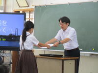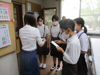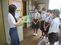 9月4日(火),先月行われた「くまもと子ども芸術祭2025inオールあまくさ」の実行委員会の岡部様が,舞台部門の総合司会を担当した6年生の子供たちにお礼を伝えるために来校されました。岡部様からは子供たち一人一人に図書券が渡されました。一方,子供たちも今回の経験の感想や感謝の気持ちを綴ったメッセージカードをお渡ししました。