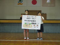 まずはじめに,児童運営委員会から運動会スローガンが発表されました。本年度の運動会スローガンは,「心を一つに!みんなが主役の運動会!!」です。みんなの意見をうまく取り入れた分かりやすいスローガンとなっています。