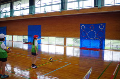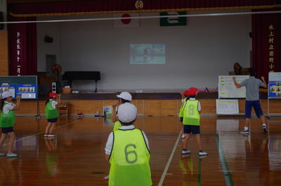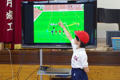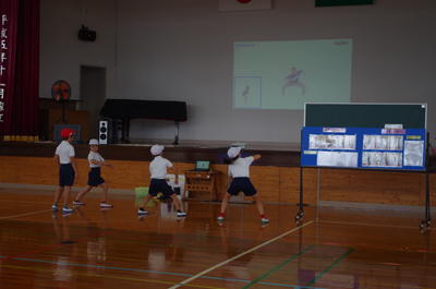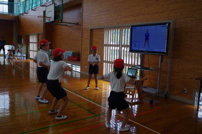 体育館ステージ上にプロジェクタを設置し、ユーチューブのダンス映像を流して、全員で踊る練習を行った。