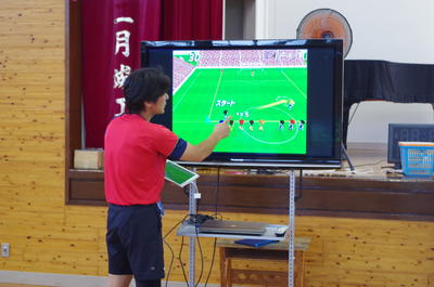チーム練習の際に、ゲームアプリを活用して動き方を理解できるようにした。チームリーダーが操作し、チームで動き方につい話し合いながら理解していった。
