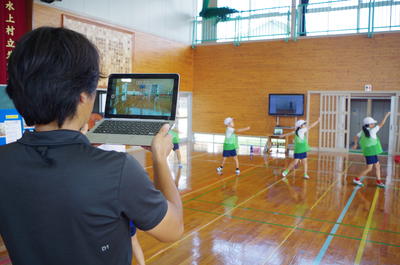 創作したリズムダンスを音楽だけを聞いて踊れるようになったチームは、タブレット端末で動きを撮影するようにした。撮影は教師が行った。撮影した動画を視聴し、「自分たちの動きがどうか」「リズムに乗っているか」など課題を明らかにして、次の練習に生かすようにした。