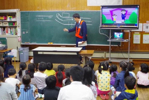 1・2年生は、1年生教室でビデオを見て、道路歩行の際の危険について学習しました。また、水上駐在署の方から実際の岩野地区の道路で危険な場所について詳しく話をしていただきました。周りをよく見て、安全を確認することや飛び出しは絶対しないことを強く話されました。