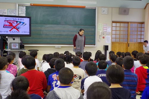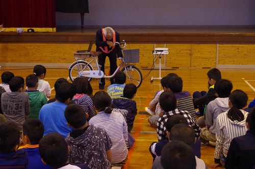 3年生以上は、体育館でビデオを見て、自転車運転の際の危険について学習しました。交通安全協会の方々から、自転車点検の際の注意点について詳しく話していただきました。ブレーキの効きはよいか、空気圧はきちんとあるか等、軽車両である自転車に乗る者としての最低限必要な点検を行うことが、自分の身を守ることにつながることを強く話されました。