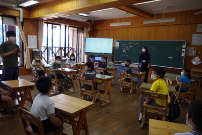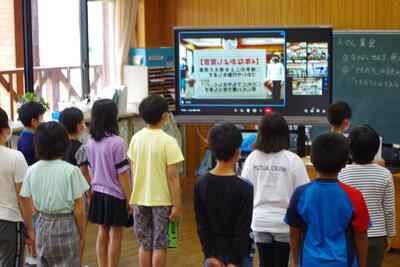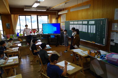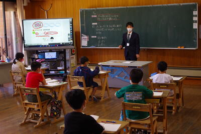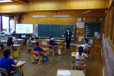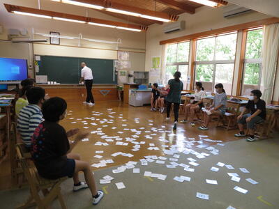 5月23日(月)、水上マンデーがありました。今回は、湯山小学校の5・6年生が岩野小へ来て合同学習を行いました。どちらの学年もデイビッド先生と担任との外国語と総合的な学習の時間の授業でした。5年生は教室に24人が集いにぎやかな学習に、6年生は5年時の集団宿泊教室以来の再会に嬉しそうな様子が見られました。