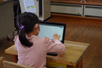 5月6日(金)ICTタイムの時間に、1年生が初めてタブレット端末を使いました。説明を聞いた後、電源の入れ方や切り方に挑戦しました。自分のパスワードにある数字や平仮名をキーボードとにらめっこをしながら見つけ、1字1字ていねいに入力していました。タブレット端末を使って、お絵かきも楽しみました。