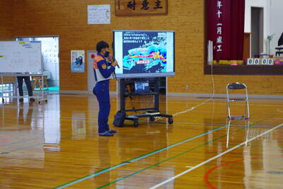 子どもたちは荷物をまとめて体育館へ避難し、上球磨消防署東分署よりお越しいただいた唐鎌さんから災害時に注意することを聞きました。