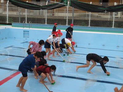 5月20日(金)に1・2年生と5・6年生が、5月23日(月)に3・4年生がプール掃除を行いました。6月からのプール学習スタートに向けて、少し肌寒い天候の中でしたが、ピカピカになるようにがんばっていました。