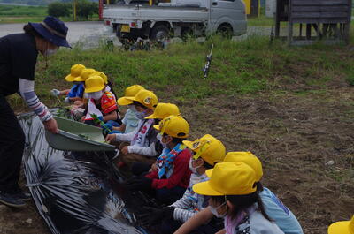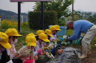 5月23日(月)、1・2年生がサツマイモの苗さしを体験しました。みんなで力を合わせて、マルチをはった後、ゲストティーチャーの猪口さんに苗のさし方を教えていただきながら、苗をさしをしました。秋の収穫が楽しみです。