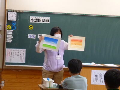 午後からは、6年生が水上中学校の畑田先生に絵の具を使った絵の描き方を教えてもらいました。真剣に話を聞き、思い思いの絵を楽しく描いていました。