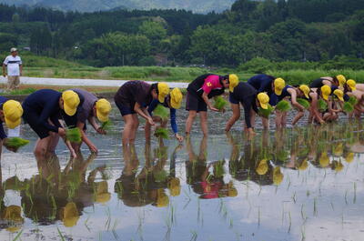 6月8日(水)に、JA青壮年部の皆様のご協力のもと、5・6年生が田植えを行いました。6月3日(金)には、代かきも行いました。泥んこの田んぼの感触を楽しみながら、昔ながらの田植えを経験し、汗をながしていました。