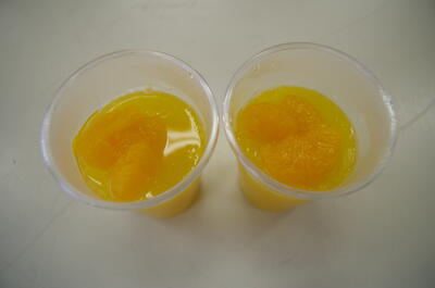 それをゼラチンを溶かしたオレンジジュースと混ぜ、カップにつぎ分けます。それを冷やすと・・・