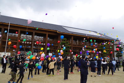 「岩野小学校ありがとう。そして、さようなら」の気持ちで風船飛ばしを行いました。