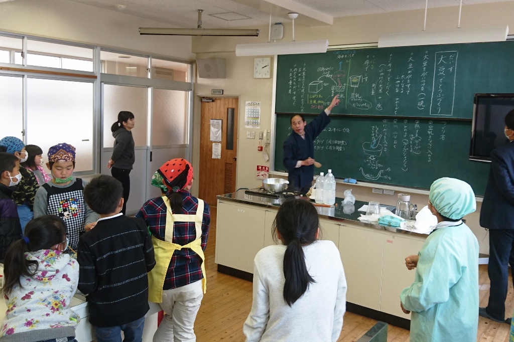3月7日(火)、3・年生は、体験ボランティアの椎葉様をゲストティーチャーとしてお迎えし、「豆腐作り」を行いました。