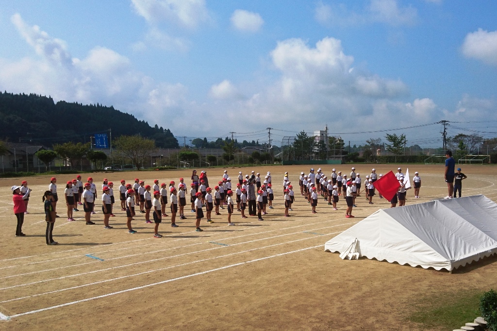 9月20日(火)、台風一過の晴天の下、岩野保育所の園児が、秋季合同大運動会参加のための練習に本校を訪れました。運動場には、いつもと違うかわいい声が響いていました。