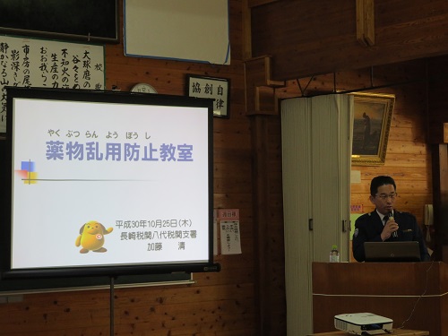 10月25日(木)薬物乱用防止教室が行われました。今年度は、長崎税関八代税関支所の加藤様にお越しいただき、ご講演いただきました。