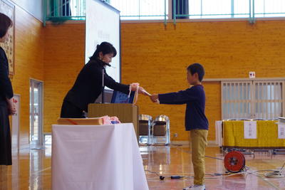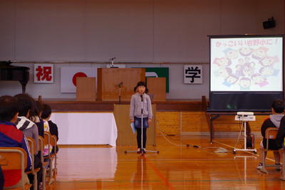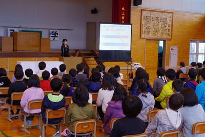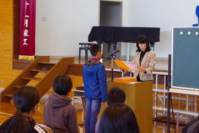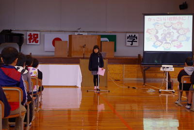 修了式の後には、転出児童の紹介と、生徒指導の話(春休みの過ごし方や帰宅時刻、交通ルールについて)、保健面の話(大人の生活リズムに合わせず、規則正しく食べ、寝て、運動することの大切さについて)がありました。