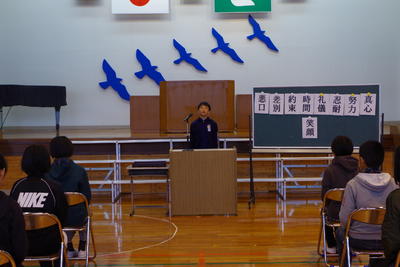 修了証授与の後は、校長先生からのお話がありました。「未来の自分は、今の自分が創る」ため、今を大切にし、一つ一つ努力していってほしいと話されました。子どもたちは真剣な表情で頷きながら話を聞いていました。