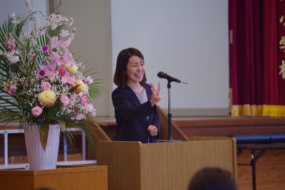 校長先生から、1年間の子どもたちの成長の様子や、「あいさつ、考え、ありがとうの響き合い」「気づき考え行動」の振り返りについての話がありました。