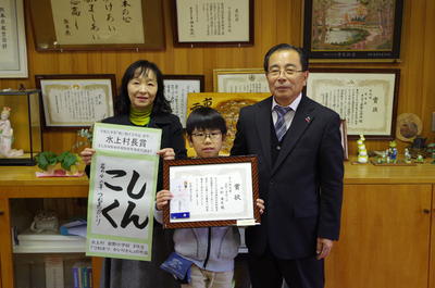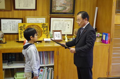 12月5日木曜日、2年生の恒松海吏くんが、税に関する作品で水上村長賞を受賞し、その表彰式が校長室にて行われました。