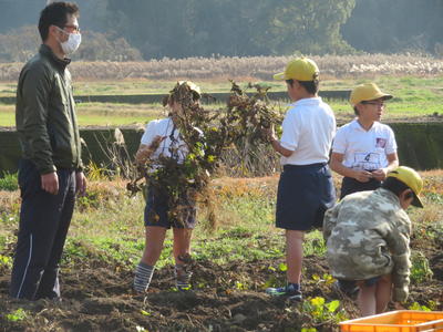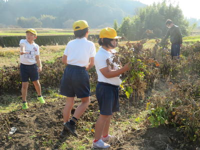 12月18日、3・4年生で大豆の収穫を行いました。今回も山の幸館の椎葉さんをゲストティーチャーに招き、収穫の仕方を教えていただきました。…天候不良だったためか、理由ははっきりしませんが、実が大きくなりきれず、ほとんど収穫はできませんでした。残念ではありますが、自然の厳しさを受けとめた子どもたちでした。
