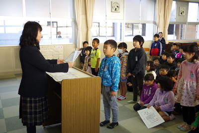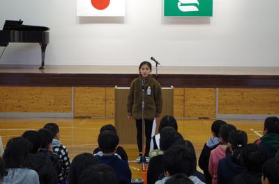 その後、1年生の小林王人さん、3年生の瓦川日愛さん、5年生の永石緑暖さんの発表がありました。2学期に頑張ったことや冬休みに頑張りたいことについてはきはきと発表することができました。