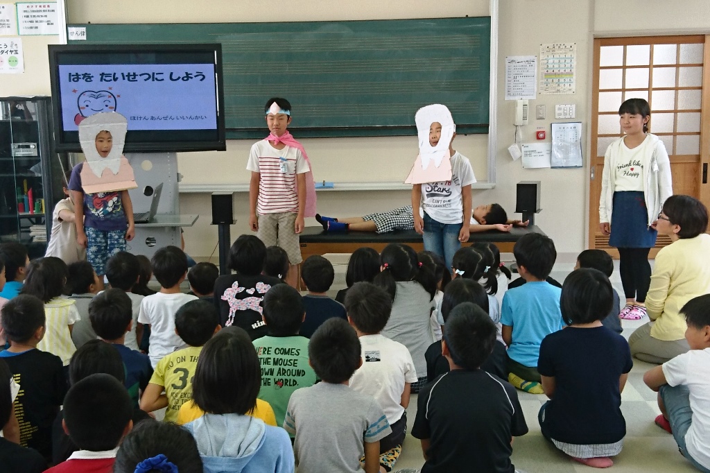 今回は、保健安全員会が、「歯を大切にしよう」とうったえました。水上村の12歳以下のむし歯有病者率は県内でワースト3位(平成25年調査)だそうです。この汚名をなんとか返上するために、歯磨きの習慣化とむし歯治療の徹底を呼びかけていました。