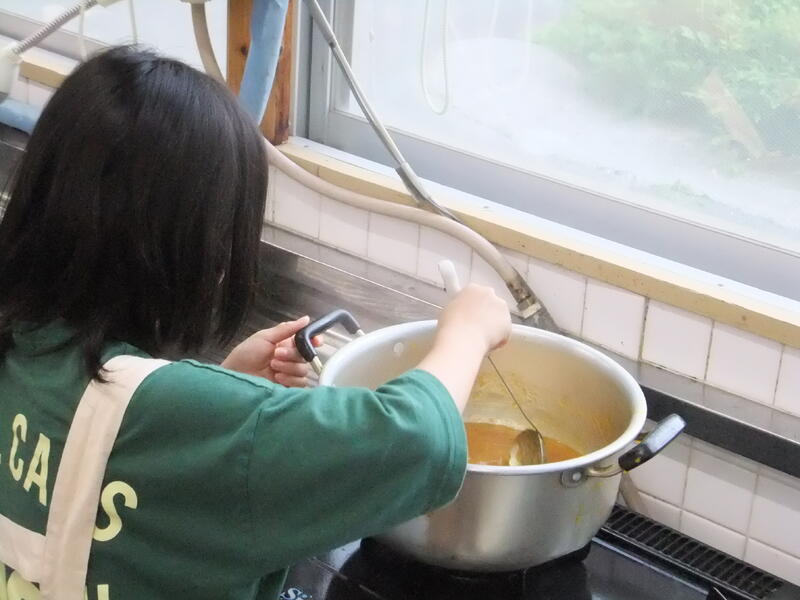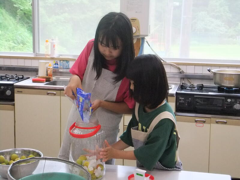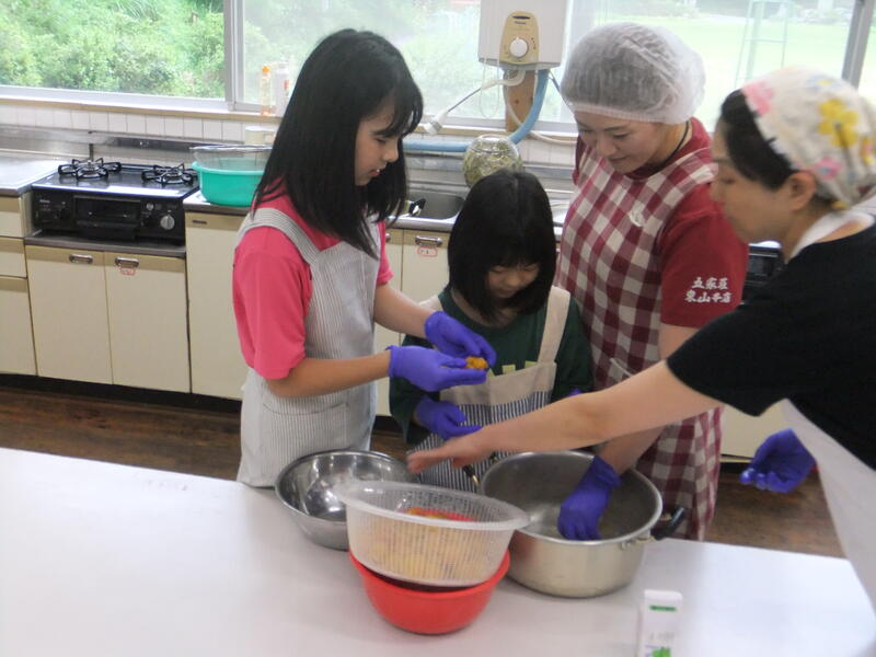 給食調理の先生を講師として、本校の4年生と6年生と保護者の方と一緒に、梅シロップと梅ジャムづくりに挑戦しました。梅は、本校の敷地内で採れた梅を使っています。きっとおいしいシロップと、ジャムができることと今からとても楽しみです。