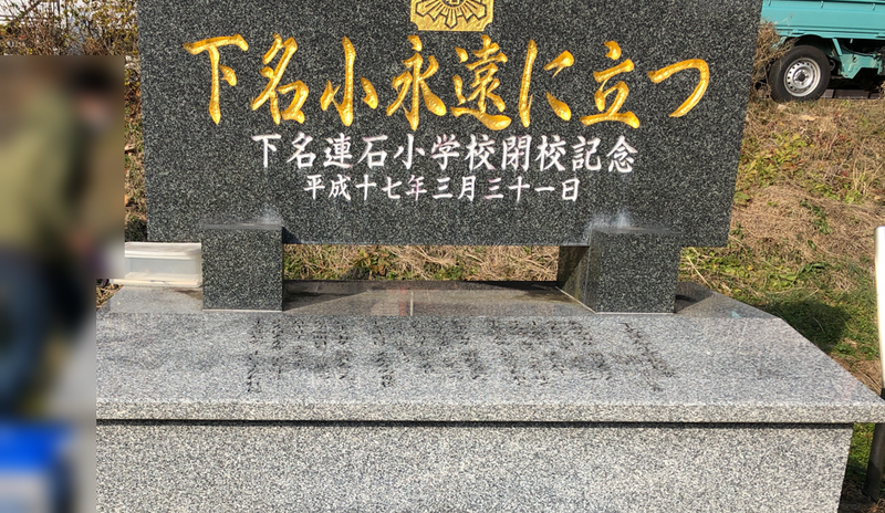 今回初めて旧下名連石小学校敷地内に入りました。校内の中でひときわ目立っていたのが閉校記念碑です。