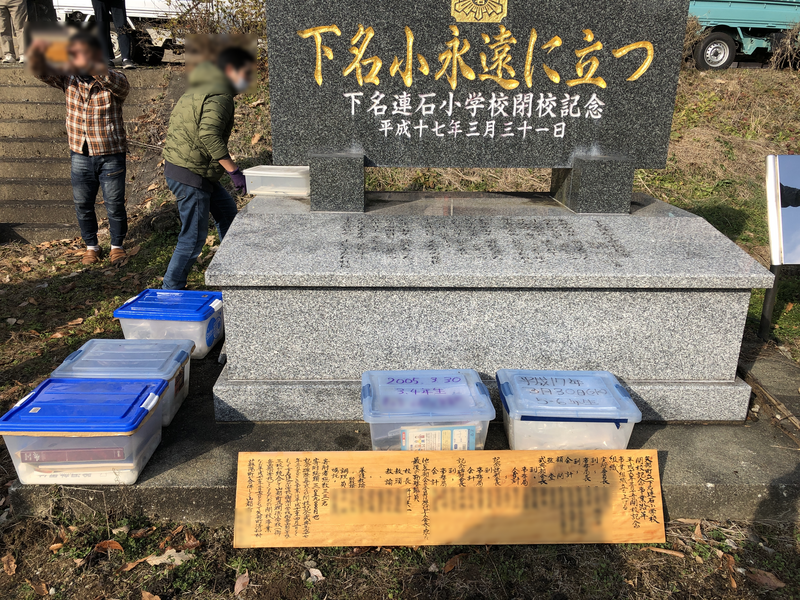 下名連石小学校記念碑の前にて