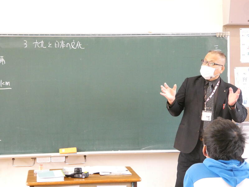 笑顔いっぱいで4つ紹介 馬刺し・からしれんこん・だご汁・タイピーエン 自身で絵を描いて説明しました。後半2つは「初めて聞いた」という反応だったようでした。