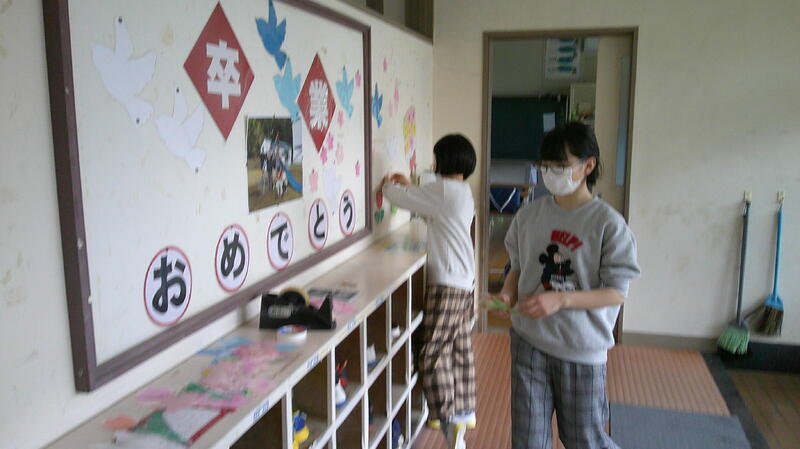 6年生教室の飾り付けをしています。こんな少人数で驚くべき教室に変身しました!