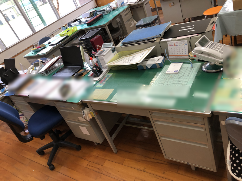 職員室の中の様子・・・出欠版がドーンとあります。カレンダーは昨年の4月で止まったまま・・・。