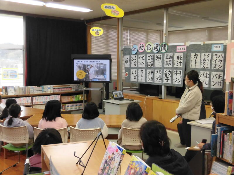 3年生は、せっかく授業参観に来られているということで「私たちの学校自慢」発表を授業の最後に入れました。ある班は給食の話題について発表しました。
