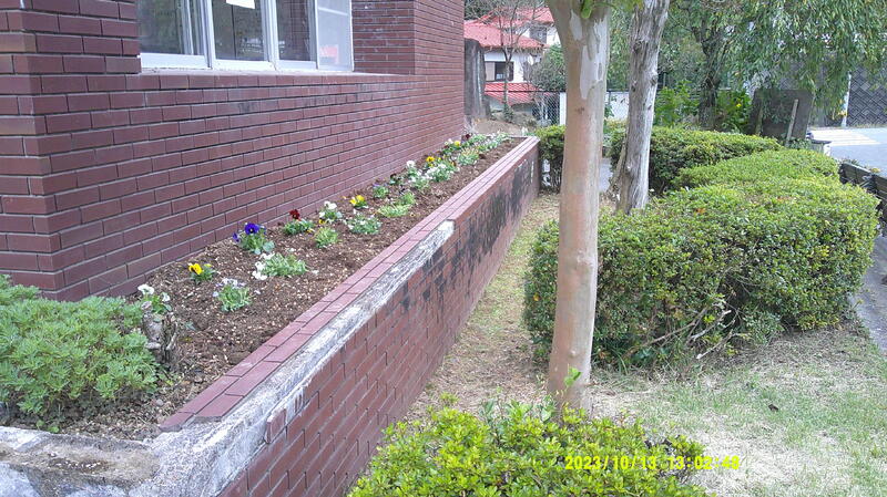 この2週間ほどで、担任外職員を中心に学校環境を整えました。グラウンドの草刈り、軽トラによるグラウンド整備、そして正門近くの花壇づくりにも取り組みました。