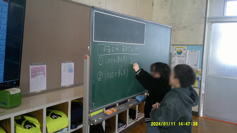 共通点も多い単元ですので、導入部分は1・2年一緒に行いました。能登半島地震→募金→集まったお金を数えるという話から2年生教科書の挿絵をみんなで見てから、各学年に分かれて授業です。