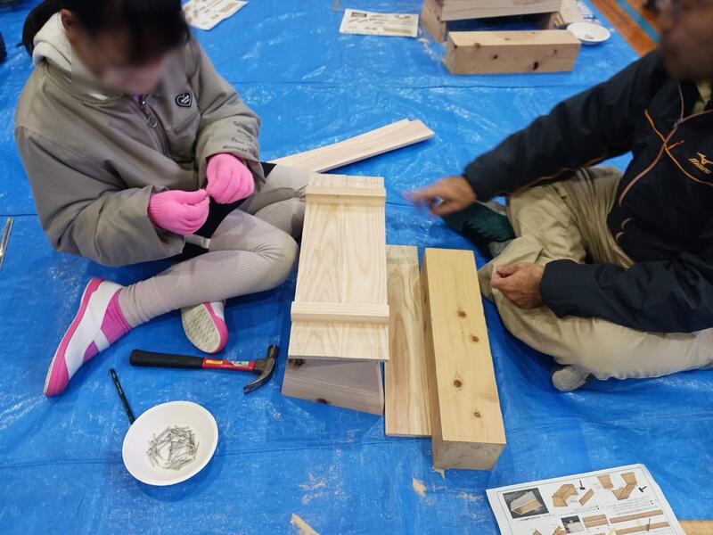 次に、体育館へ移動し、作り方の説明を聞きました。子どもたちははじめて使うのこぎりやかね尺を使って
