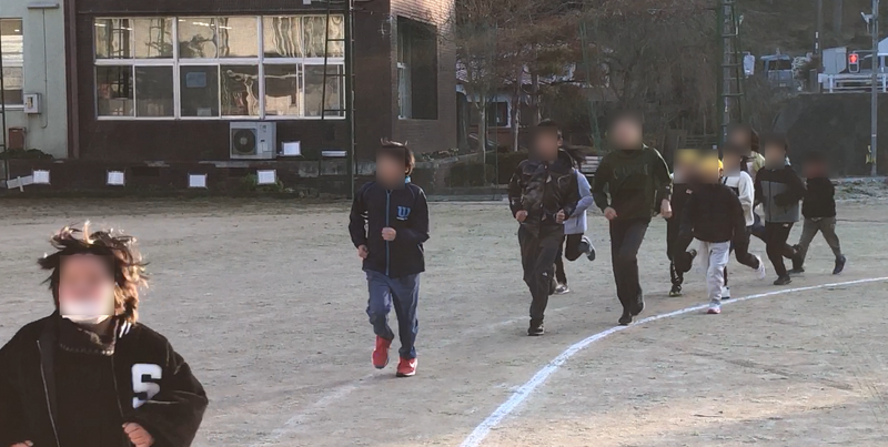 子どもたちの中には寒さに負けず半袖、半ズボンで走り回っています。