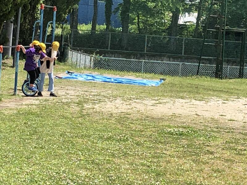 4年生Mさん・Kさんの手つなぎ運転です。運動場の端から端までこの状態で運転し、さらに私の周りをこのまま回っていました。1年生のJさんも、この数日でグンと成長しました。「アイのチカラ(何のことかは本人に聞いてください笑)」効果もあったのでしょう!