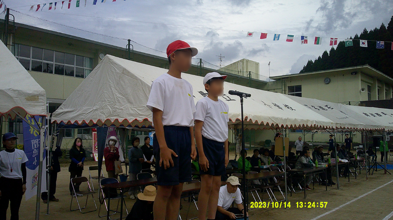 今年は、得点競技にせず実施しました。しかし、練習からの子どもたちのひたむきな態度、本番でも練習の成果を発揮し、なかまと協力し、運動会を楽しむという3つのお願いを体現してくれました。また、本日参加された皆様も積極的に参加して盛り上げてくださいました。そこで、この優勝旗はここにいる皆さんで分かち合いたい!と考え、両団長に代表として優勝旗を授与しました。