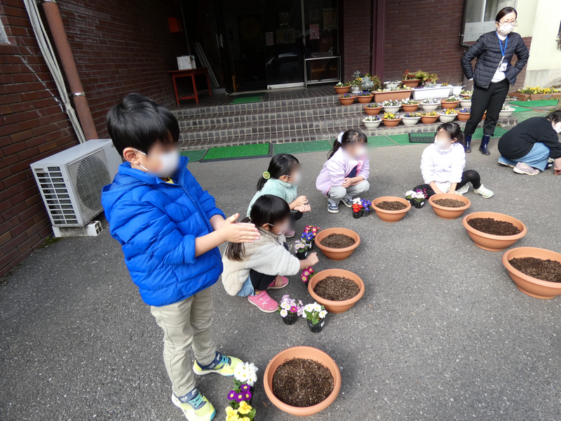花植えをしました。鉢にはすでに新入学児の名前が書いてあります。