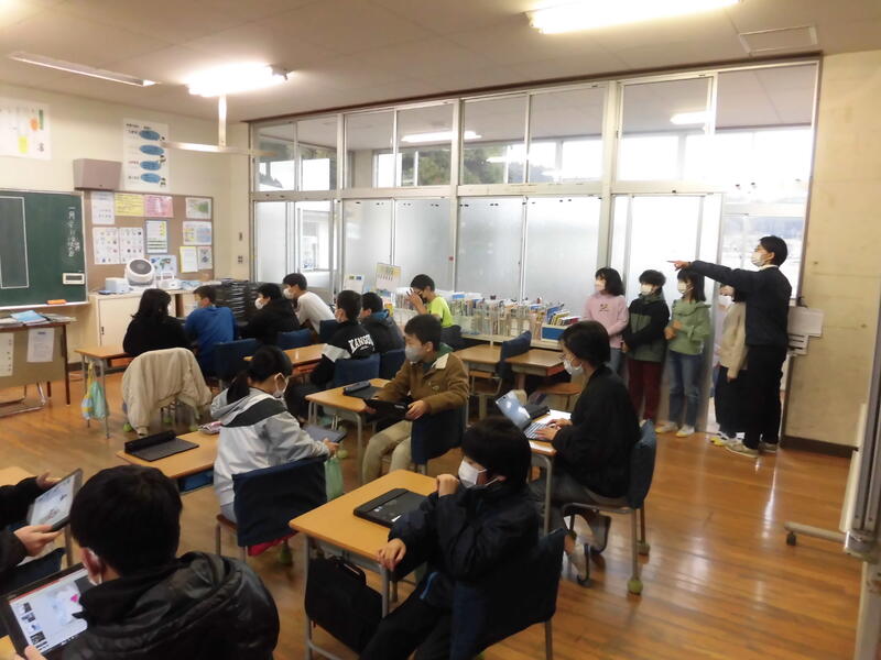 今回は、5年生交流ですので6年生にはカメラに入らない範囲のところに移動してもらいました。6年生協力ありがとう!!また3年生は今後の交流に備えて様子を見学に来ていました。このように、いつでも複数学年が集まれるのが小規模校の強みです!!