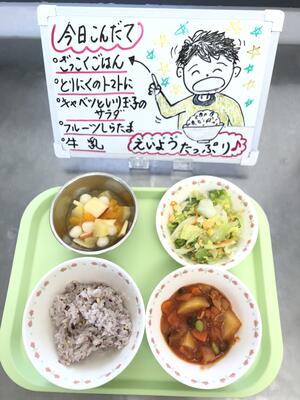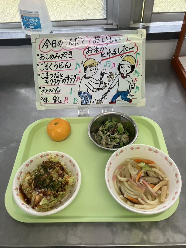 最近、出張が多く不在がちの校長ですが、午後からの出張なので給食を食べてから出かけることができているのが何よりの救いです。さて、今日はおこのみやき+うどんということでなかなかのボリュームでした。小松菜は、潤徳農園から?このサラダが絶妙のバランスメニューとなっていました。給食でパワーをつけた後は、昼休みに迎えに来た1・2年生と・・・。さて、何があったのか?そのヒミツは、後日わかります!