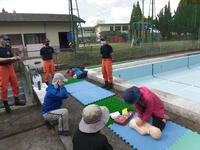 学童に通う児童たちや職員の方も、研修の様子をプールの外から見学。本校職員が心肺蘇生実習で汗だくになりながら人形の胸を押す場面では、子どもたちから「がんばれ~」の声援をもらいました(^▽^)