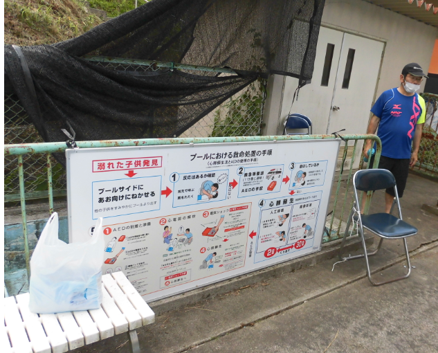 6/8(水)の放課後に本校職員校内研修の一環として、水泳の授業がスタートする前に本校職員全員で「AEDを用いた心肺蘇生法の実践」を本校プールサイドにて実施しました。※この日出張等で不在だった職員は後日に実施します。消防署から特別にAEDと人形を借りています!