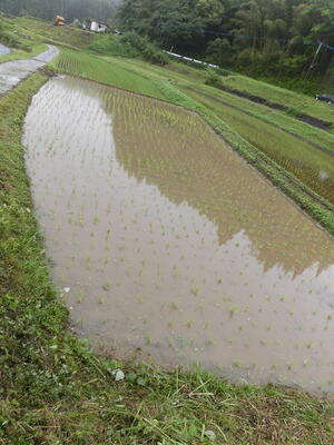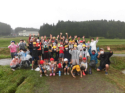 ここ数年は、コロナ禍で5・6年生だけで田植えを行っていましたが、今年は小雨の中「全校児童」で実施しました。