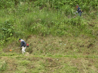 本来は美化作業を6/11に実施する予定でしたが、雨天のため延期。さらに急遽、18日(土)に実施することになりましたが、予定があるということで前日や早朝に来て作業をしていただいたご家庭もあり、この日も少人数でしたが広範囲の除草作業を実施できました。山の斜面は、経験豊富な保護者の方々にお願いしました。