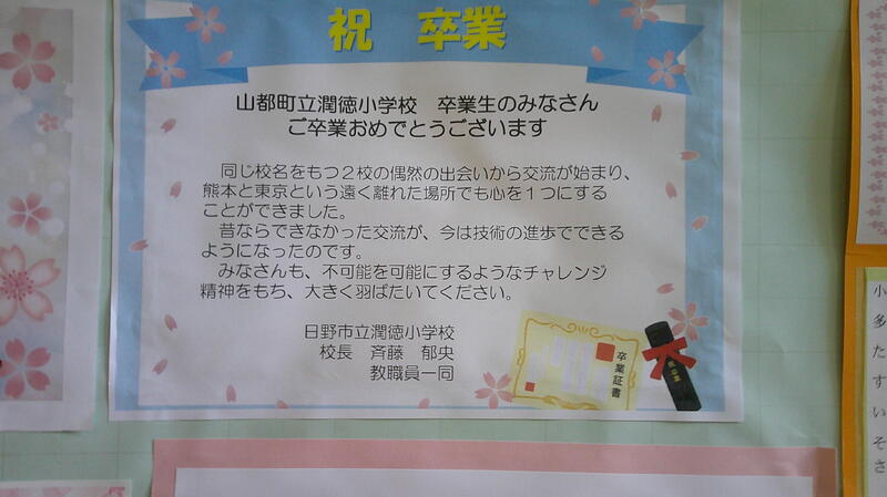 【6年】(日野)潤徳小から祝詞が届きました! 投稿日時 : 2023/03/22 承認者 東西潤徳小コラボの「相棒」である、東京都日野市・潤徳小学校から卒業生に祝詞が届きました! ちなみに、本校からも(日野)宛て コチラを参照!! に送付しています。 ちなみに、(日野)潤徳小の卒業式は24日(金)とのことです。 Tweet {{options.likeCount}} {{options.likeCount}} 0 コメント